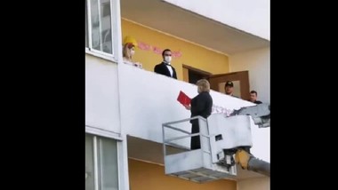 Ljubezen v času korone: Ruska matičarka poročila zaljubljeni par kar na domačem balkonu (VIDEO)